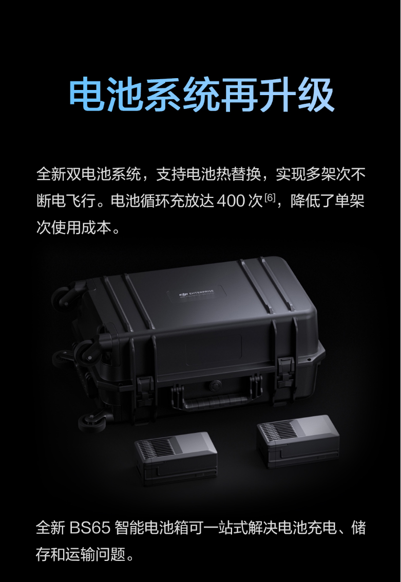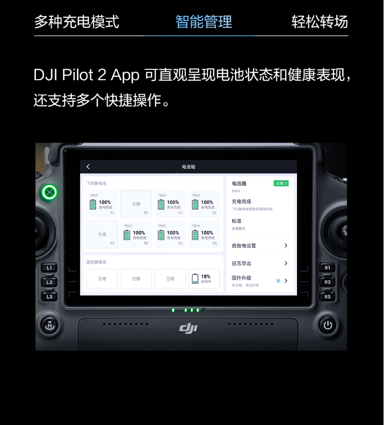 使用 110 伏電源時,完全充滿兩塊 TB65 智能飛行電池約需 70 分鐘,從 20% 充到 90% 約需 40 分鐘。