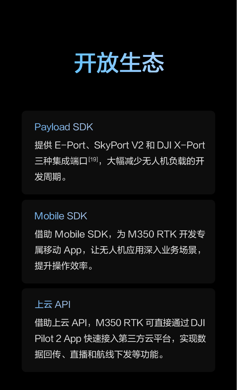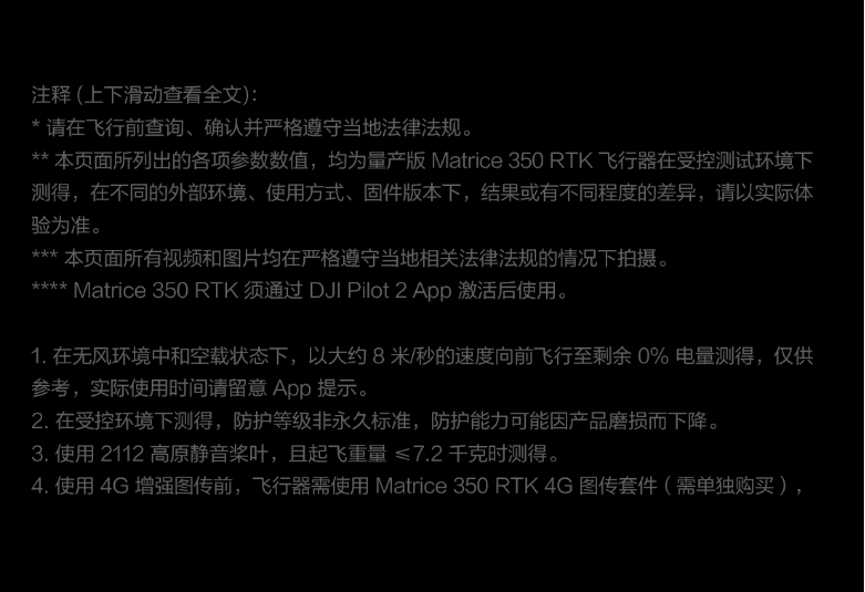 在 FCC 標準下,飛行于各類無遮擋、干擾強度典型的環(huán)境,飛行高度約為 120 米時測得以上數(shù)據,僅供參考。實際數(shù)值可能因所處環(huán)境的遮擋、干擾情況而異,請留意 app 提示。